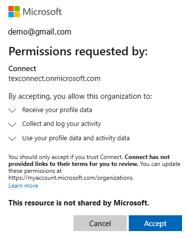 5. Give Connect the permission to read your name, e-mail address and photo and click Accept.