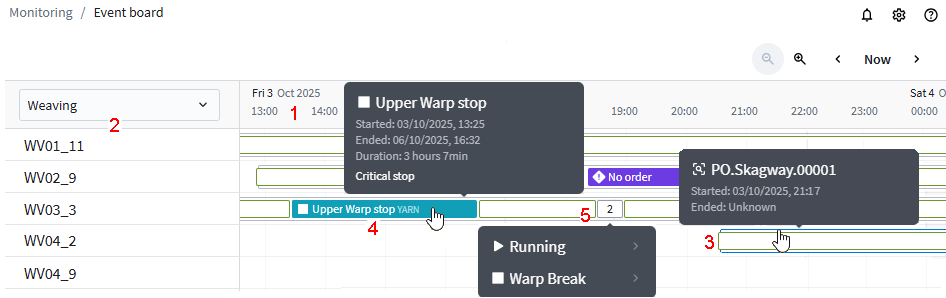 The Event board module (section MONITORING) is a timeline based overview of your machines with their production orders and events. Via tooltips, you can see more details about each event and production order.