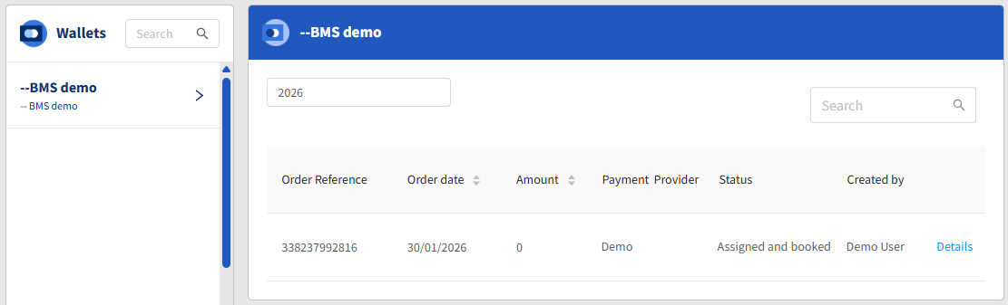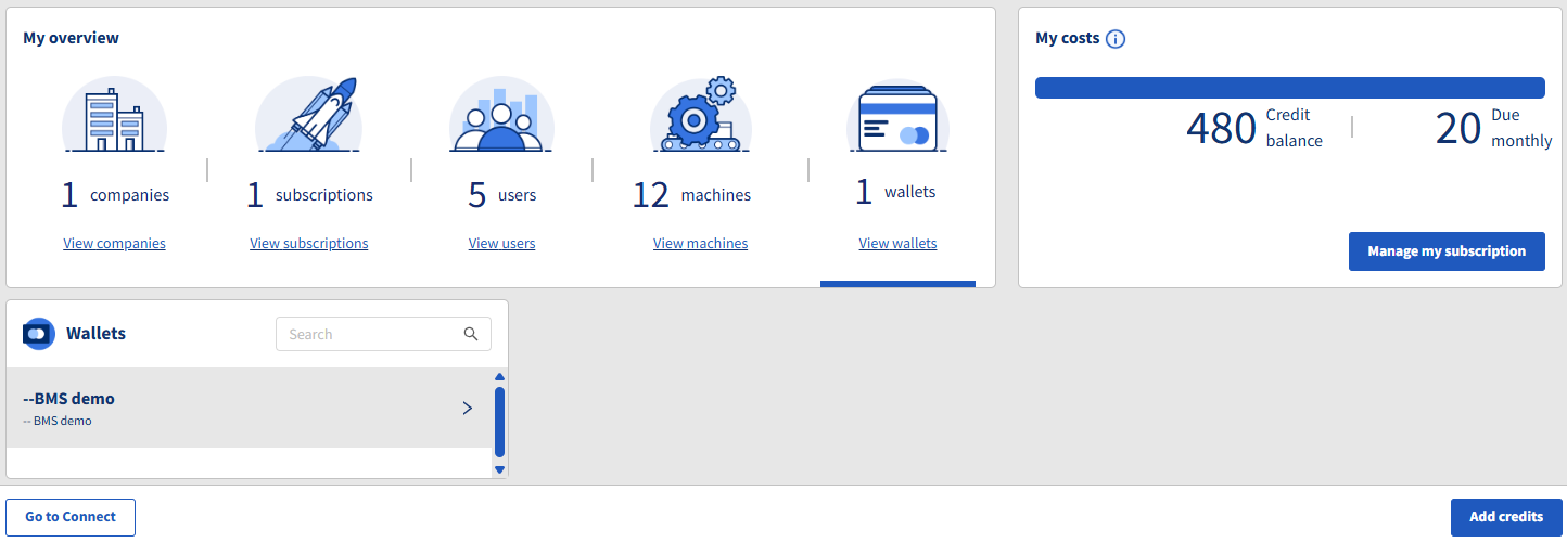 The Wallets view in the Connect Admin module (https://admin.texconnect.io/) provides an overview of all orders related to your Connect account. Customers using the credit system can order credits via the Wallets view.