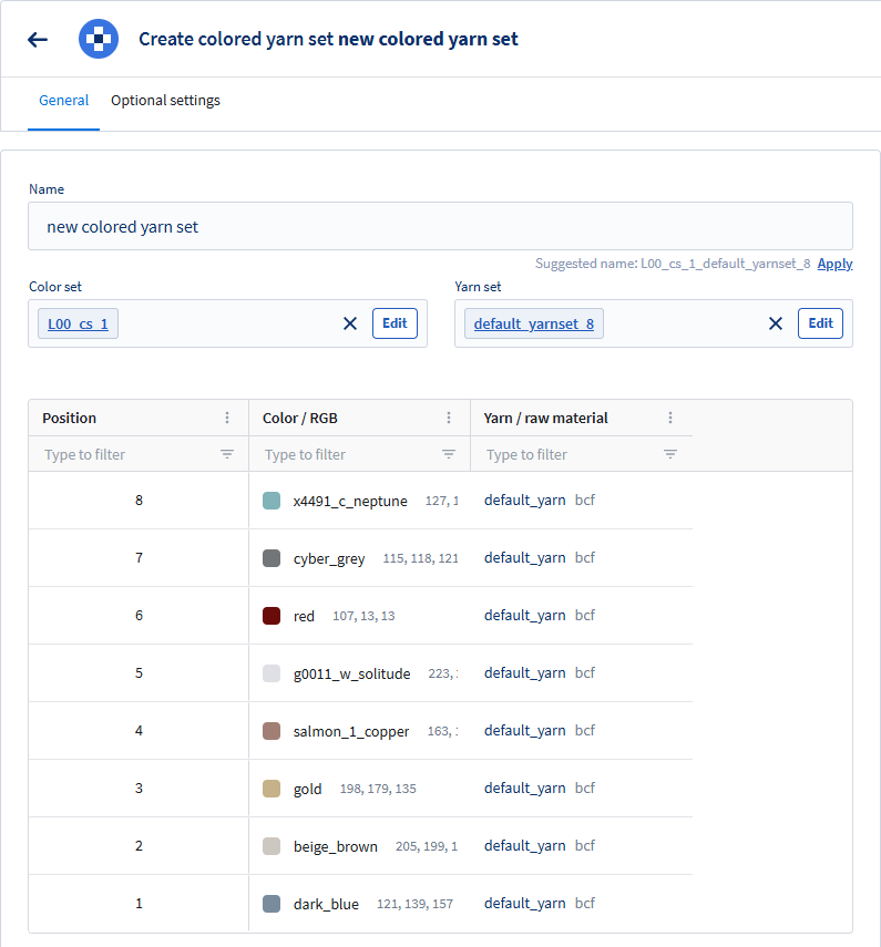 The Optional settings tab is not available for Weft colored yarn sets. - Click Save.