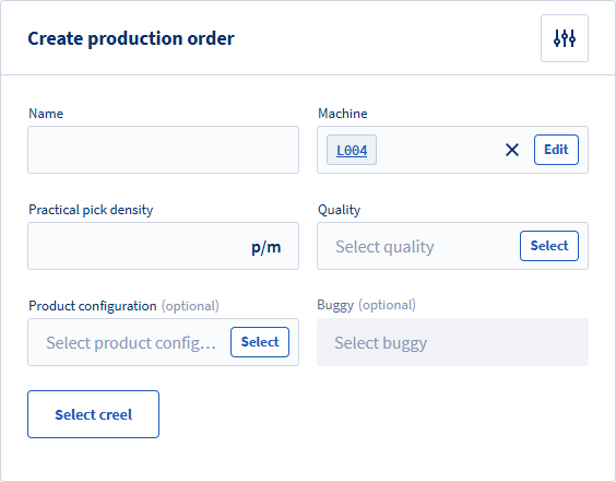 If no Quality nor creel is defined for the machine, you can select it next. By default, the settings of the last confirmed order for the chosen machine are used.